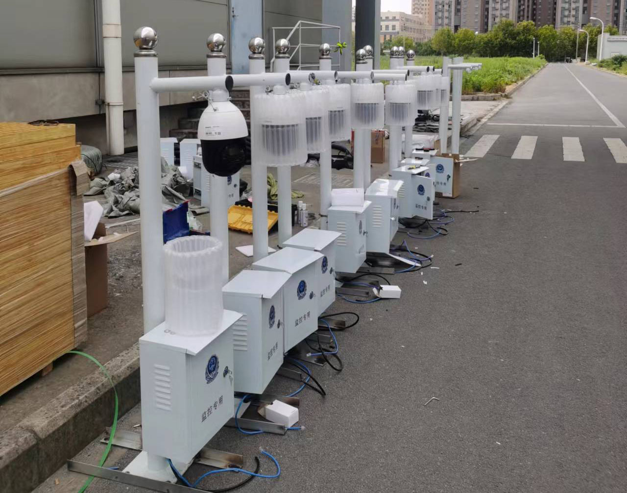 厂区道路围墙屋顶监控立竿安装,全部360度摄像头,光学22倍变焦,警戒、报警一体式。