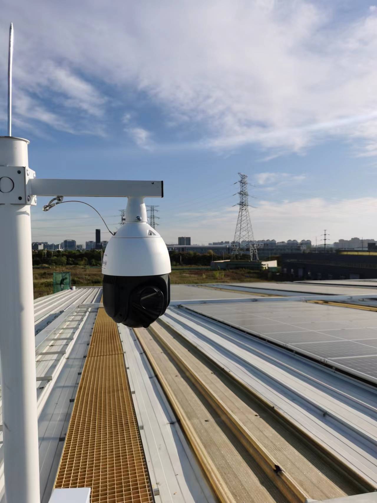 屋顶太阳能光伏发电项目并网监控安装,监控东西各装一台海康威视4寸球机,22倍光学变焦,内置物联网卡,只需电源即可实现实时画面监测,保障光伏发电板正常运作。